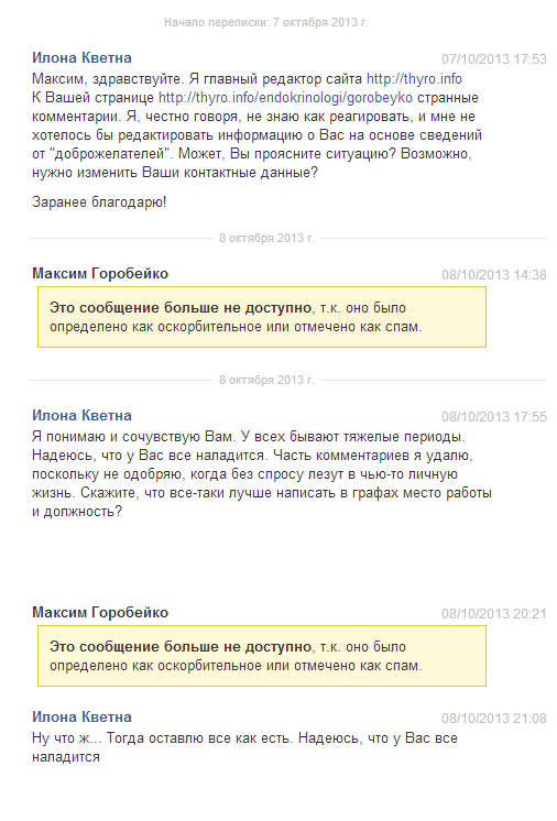 1. Ладно, допустим, со мной общался кто-то, кто вы давал себя за Вас. Сейчас страница, с которой было общение, удалена. Вот принтскрин.http://thyro.info/wp-content/uploads/2014/05/Bez-imeni-1.png